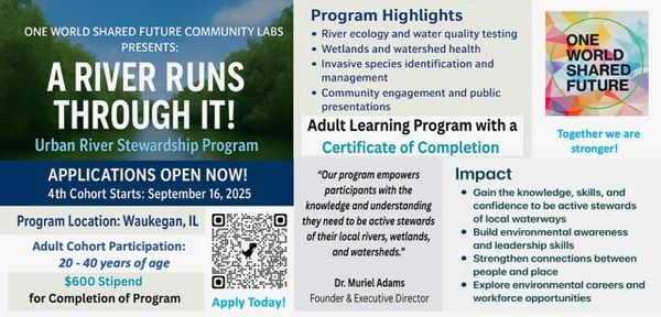Your support and contribution to our New Urban River Stewardship program will enable us to meet our program goals and fund our mission to educate and train 4 cohorts of paid participants and volunteers to protect and nurture our precious Lake County Urban Freshwater Ecosystems so they and we can flourish.#BlueWorkforce